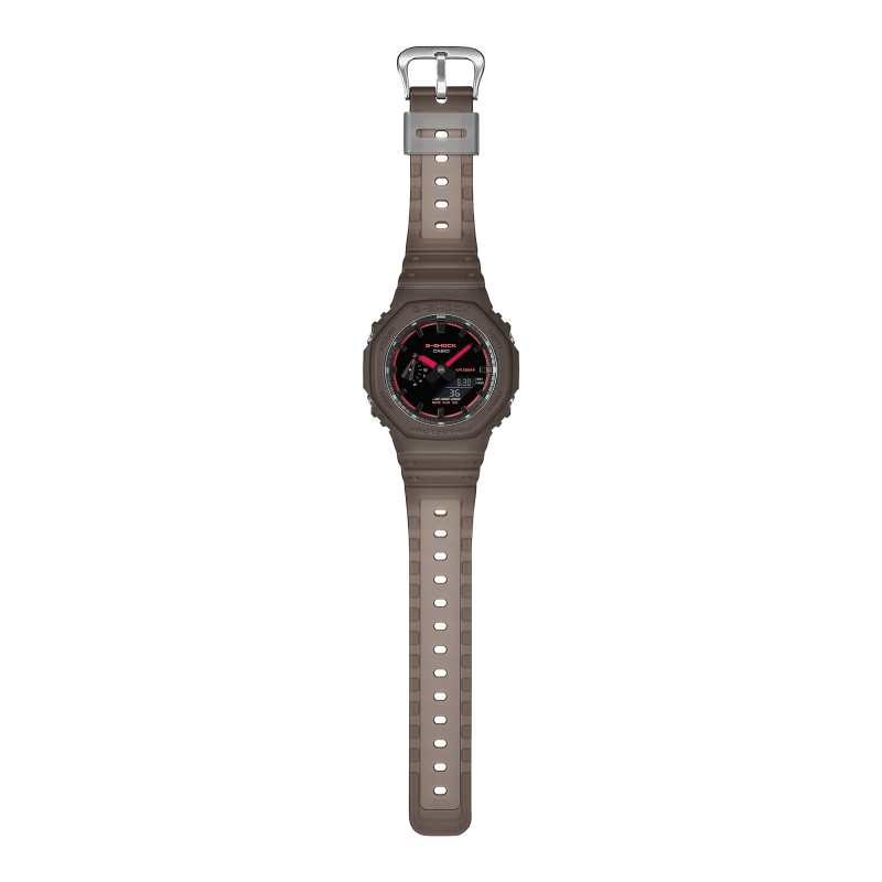 A fekete számlapot élénk piros részletek emelik ki, amelyek sportos és dinamikus megjelenést adnak az órának. A matt, áttetsző barna tok és szíj különleges textúrát biztosít, amely a füstgépekkel telített koncert- és klubhangulatot idézi.