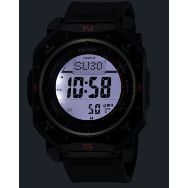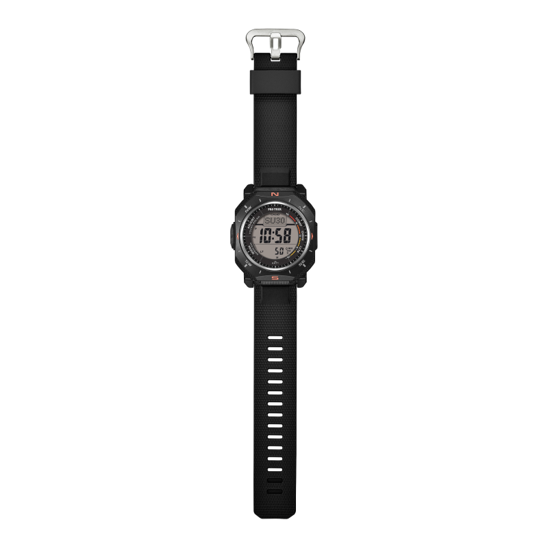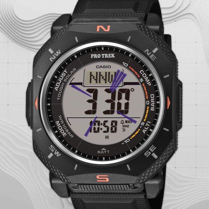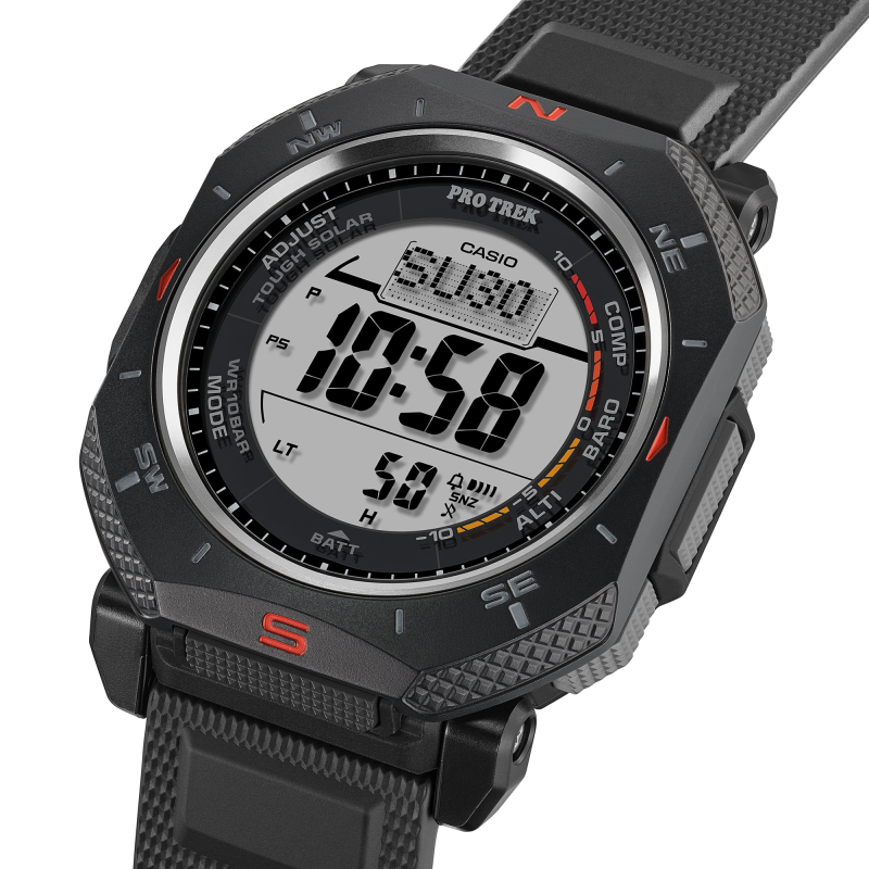 A karóra Tough Solar napelemes töltőrendszerrel működik, amely napfényből vagy mesterséges fényből tölti az akkumulátort, így hosszabb túrák során sem kell aggódni az elemcsere miatt. A Triple Sensor technológia segítségével az óra iránytűt, magasságmérőt, barométert és hőmérőt kínál, így minden fontos környezeti információ azonnal elérhető.