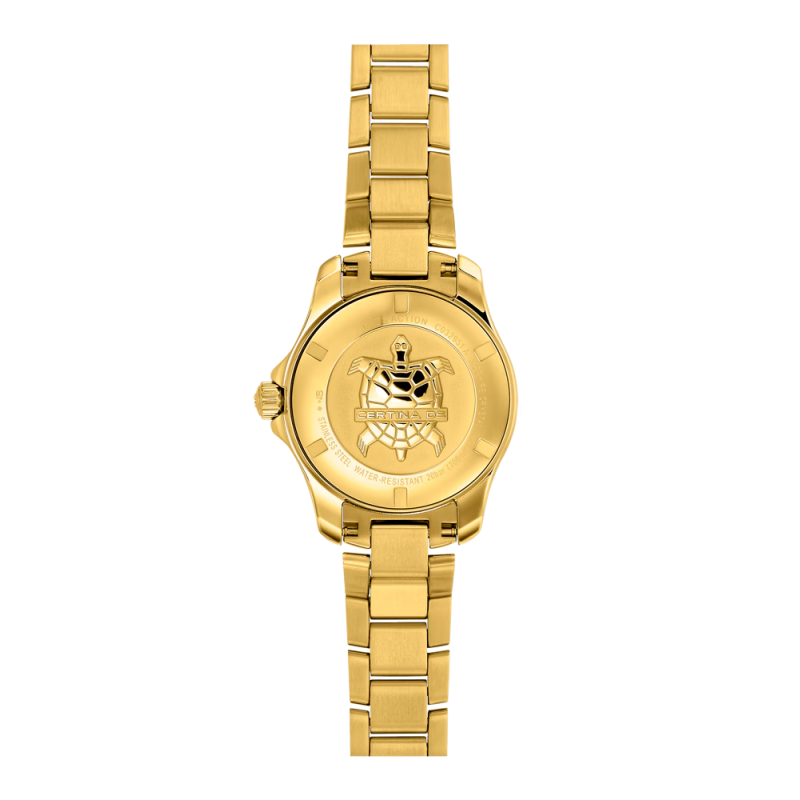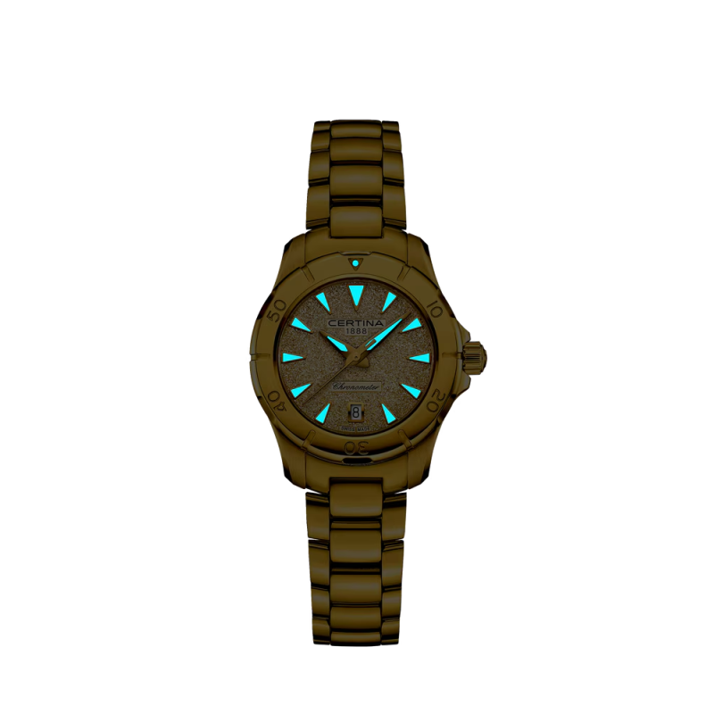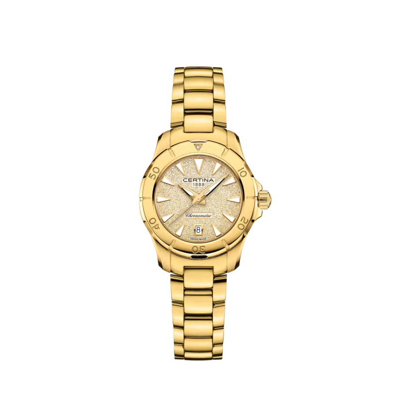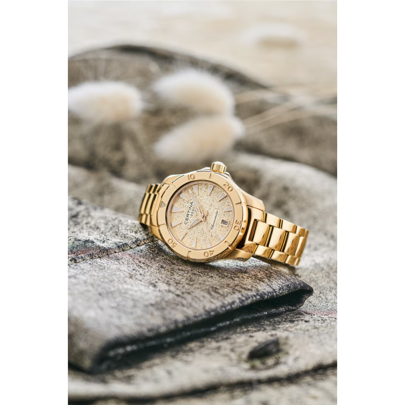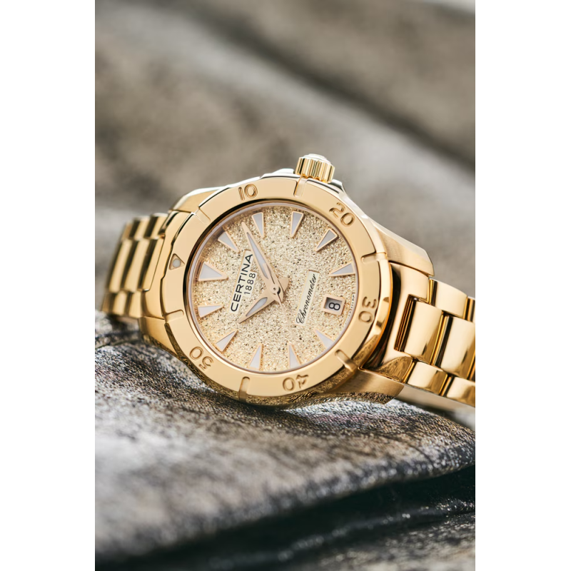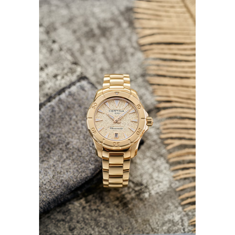 A Certina DS Action Lady arany kronométer karóra az aktív nők tökéletes kísérője – COSC-igazolt pontossággal, 200 m vízállósággal és káprázatos megjelenéssel.
