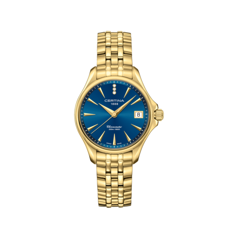 A Certina DS Action Lady Diamonds kék számlapos, arany kivitelű változata a női elegancia és a svájci pontosság megtestesítője – mindennapokra és különleges alkalmakra egyaránt.