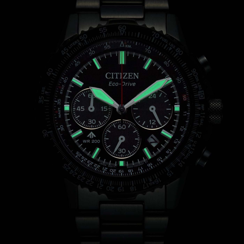 A Citizen CA4664-60E Promaster Sky Eco-Drive Chronograph a professzionális pilótaórák világába kalauzolja viselőjét. A fekete számlap három segédszámlappal és piros másodperctüvel látványos és azonnal leolvasható kijelzést nyújt.