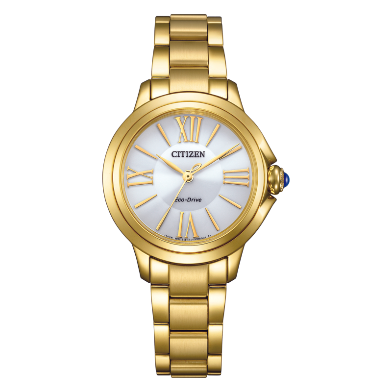 A Citizen EM1162-52A a nőies elegancia és a modern technológia tökéletes találkozása. A Citizen L kollekció részeként kifinomult megjelenést kínál római számokkal, ívelt tokoldalakkal és egy különleges, kék díszkővel (kaboson) ékesített koronával.