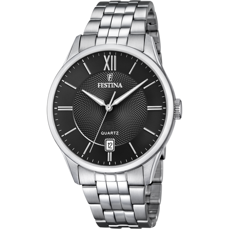 A Festina F20425/3 férfi karóra elegáns megjelenést és megbízható teljesítményt nyújt. A nemesacél tok és a nemesacél szíj harmonikus kombinációja időtálló stílust képvisel, amelyet a fekete számlap tesz egyedivé.