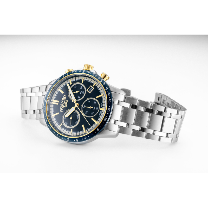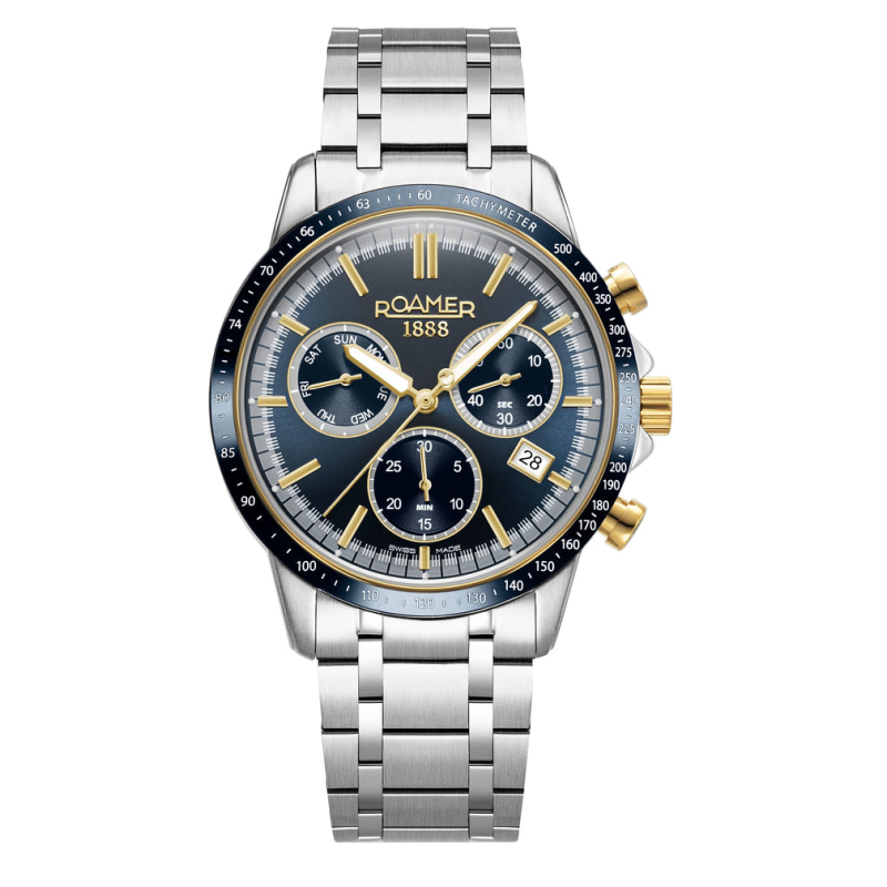 A Mercury Chrono kék–arany kiadása elegáns, sportos és precíz Swiss Made modell – a Roamer prémium kronográfjainak egyik leglátványosabb darabja.