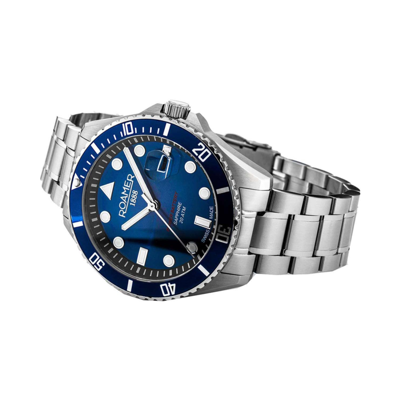 A Roamer Pro Diver 200 a klasszikus búváróra stílusát ötvözi a Swiss Made minőséggel és a kimagasló tartóssággal. A mélykék, napfénycsiszolt számlap és a hozzá illő kék forgatható lünetta sportos, mégis elegáns megjelenést nyújt. A modell lelke egy megbízható, 5 köves svájci Ronda 715Li kvarc szerkezet, amely hosszú élettartamú lítium elemmel működik.