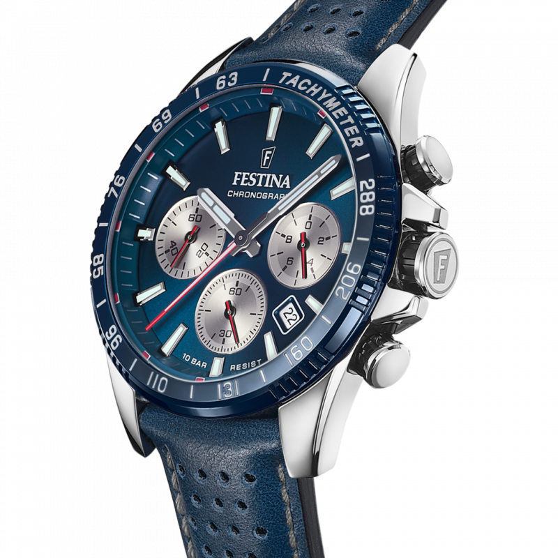 A Festina F20561/2 férfi karóra a sportos dinamizmus és az elegáns megjelenés tökéletes kombinációja. A kék számlap, a tachymeter skála és a kontrasztos piros részletek igazán karakteres megjelenést biztosítanak, míg a perforált kék bőrszíj kényelmes és modern viseletet kínál.