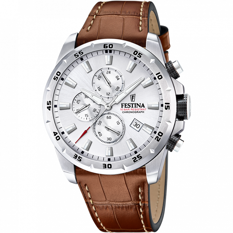 A Festina F20692/1 férfi karóra a sportos dinamika és az elegáns részletek tökéletes kombinációja. Az ezüst színű számlap letisztult, mégis karakteres megjelenést biztosít, amelyet a barna bőrszíj tesz igazán stílusossá és időtállóvá.