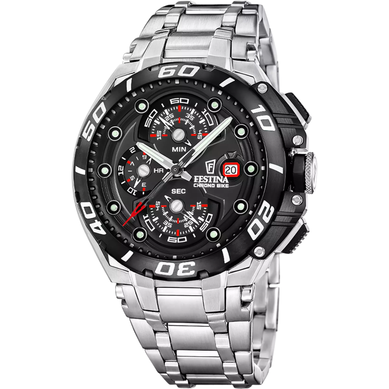 A Festina Chrono Bike kronográf karóra a sportosság és az elegancia tökéletes ötvözete. A fekete számlap és a nemesacél tok elegáns, mégis sportos megjelenést biztosít.
