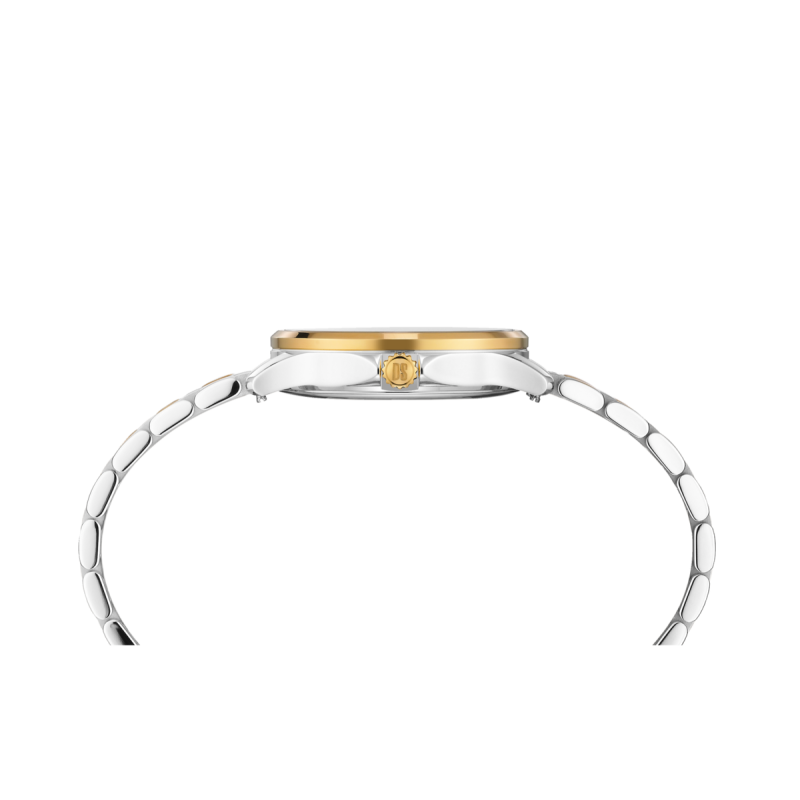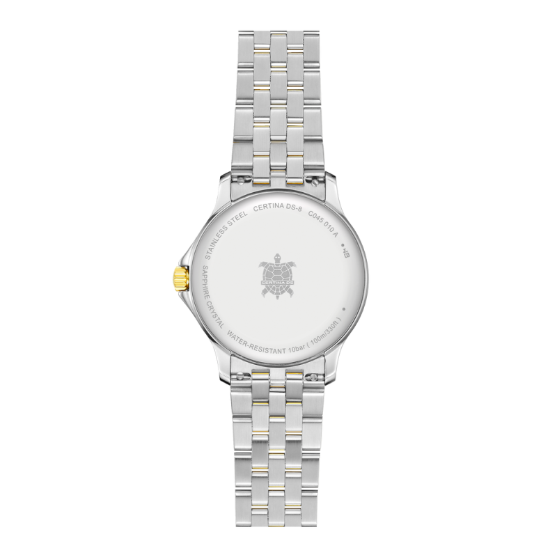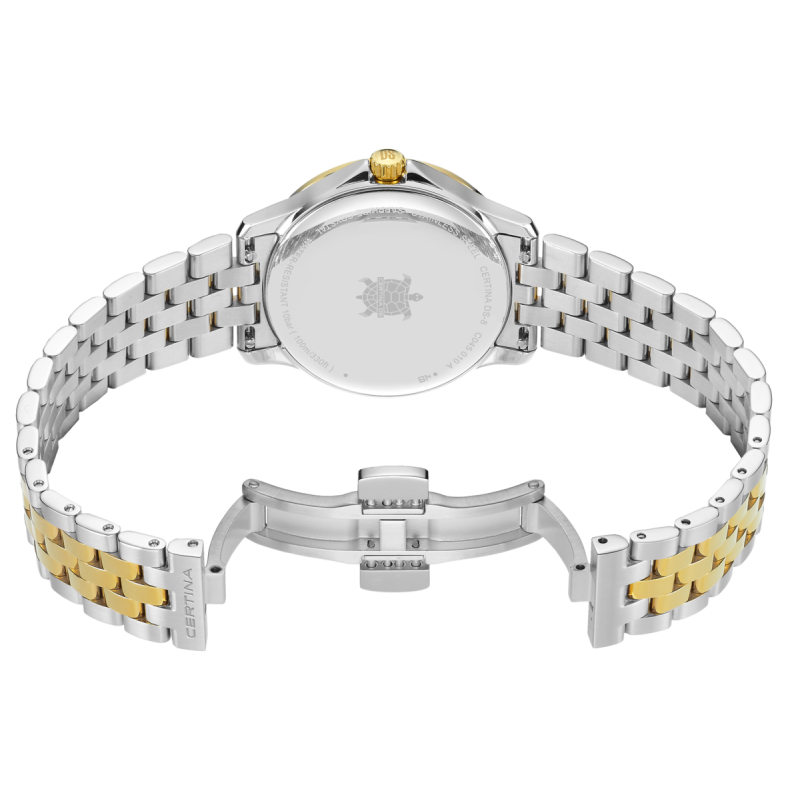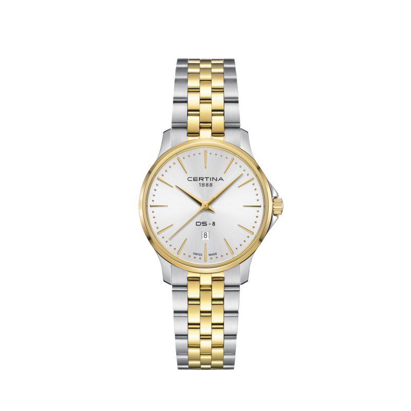 A Certina DS-8 Lady 31mm a kifinomult elegancia és a svájci precizitás tökéletes ötvözete. Letisztult vonalvezetése és kéttónusú – aranyszínű PVD bevonattal kombinált – nemesacél kialakítása időtálló stílust sugároz, amely bármely alkalomhoz tökéletes választás.
