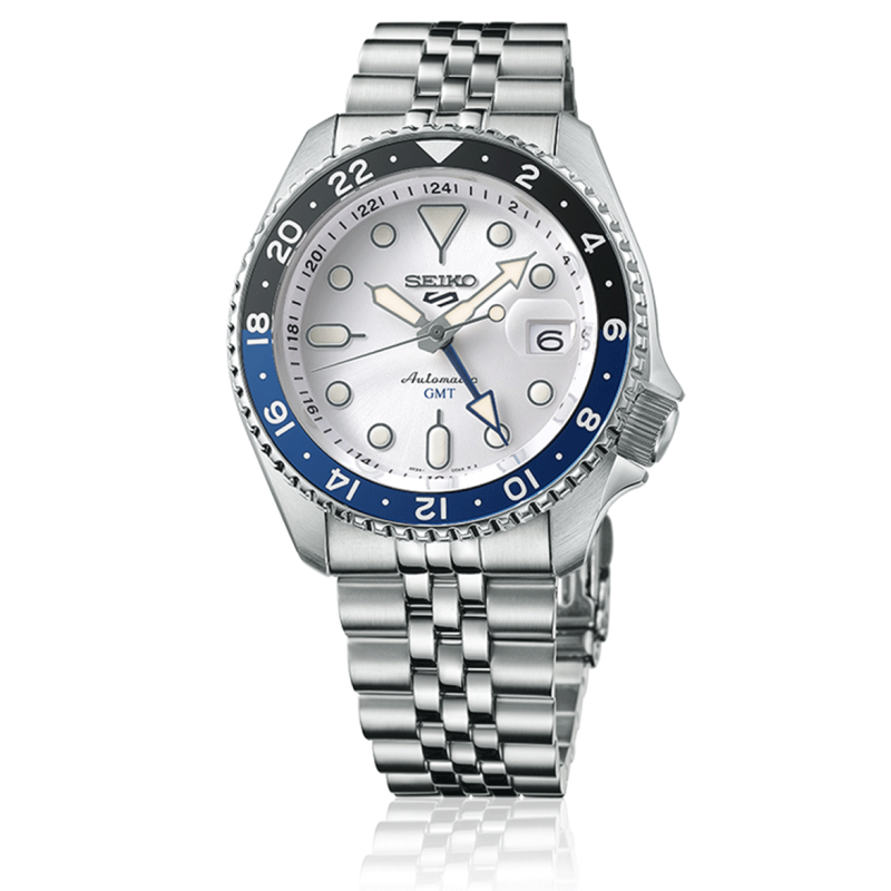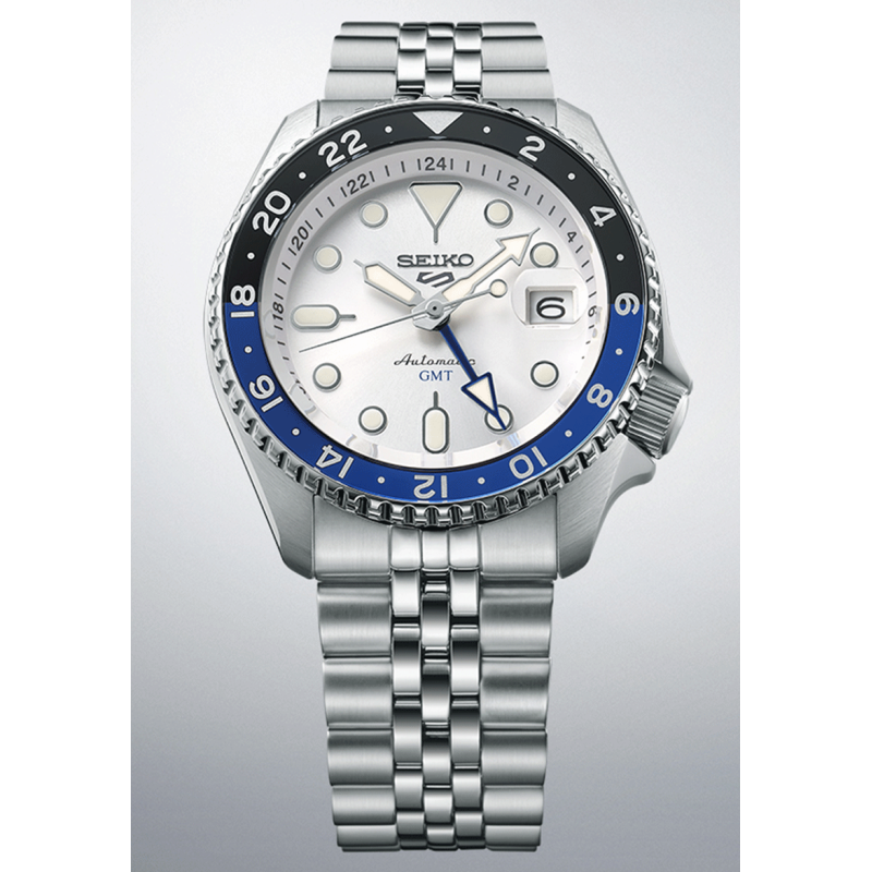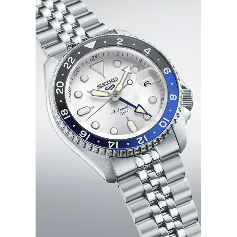 A Seiko SSK033K1 5 Sports SKX GMT friss, világos színvilágával az ég kékjét és a felhők ezüstfehér árnyalatait idézi. A kéttónusú kék-fekete GMT lünetta és az ezüstös-fehér számlap sportos, mégis letisztult karaktert kölcsönöz a modellnek.