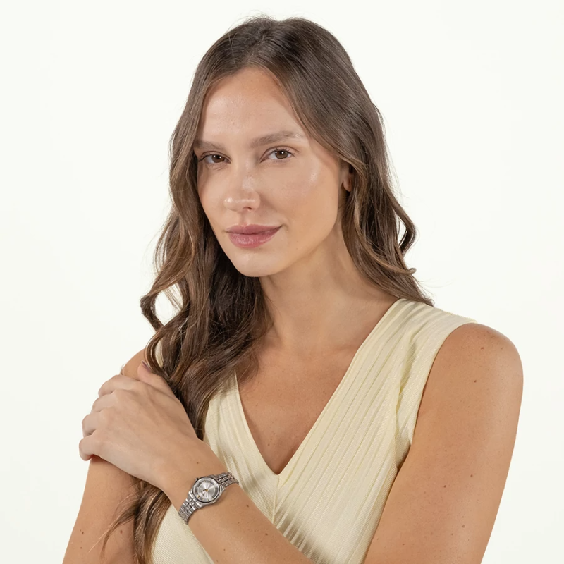 A 25 mm-es kerek tok nőies, visszafogott méretű, amely ékszerszerűen simul a csuklóra. A finoman mintázott ezüst számlap és a minimalista indexek elegáns, időtálló megjelenést biztosítanak.
