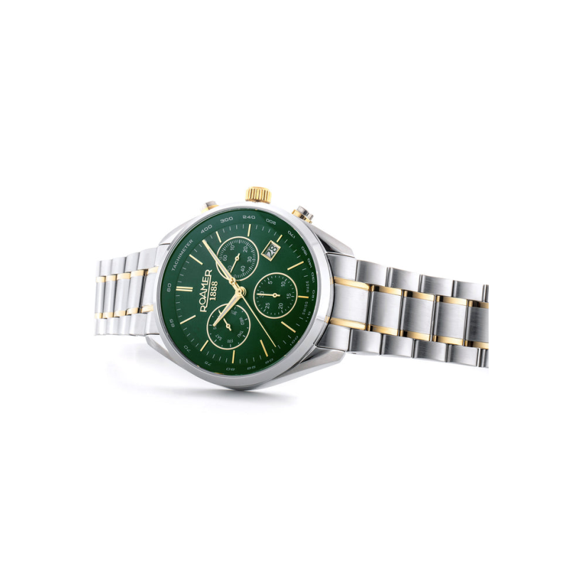 A Roamer Pro Chrono zöld számlappal és elegáns arany részletekkel igazán különleges megjelenést kínál. A svájci Ronda kronográf szerkezet precizitása, a domború zafír kristályüveg tartóssága és a 100 méteres vízállóság ideális választássá teszi mindennapi viseletre, sportos alkalmakra és elegáns megjelenéshez egyaránt.