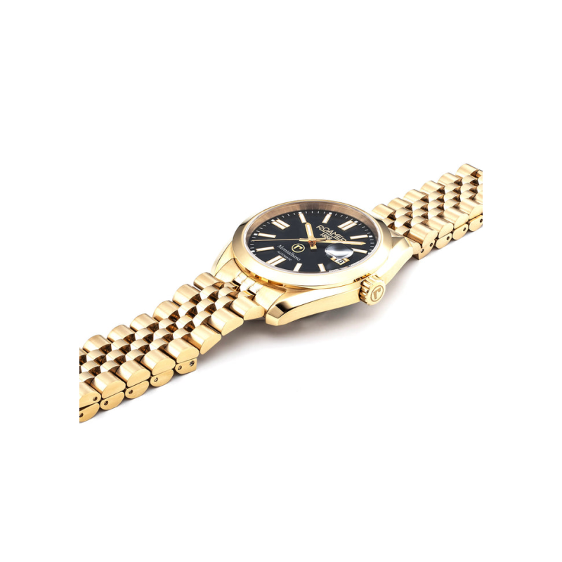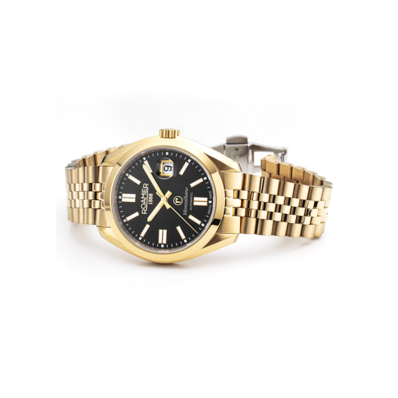 A Roamer Montalbano Gents egy elegáns, klasszikus megjelenésű svájci automata óra teljes arany színű kivitelben. A fekete számlap arany indexekkel és mutatókkal időtálló, letisztult dizájnt nyújt, míg a megbízható Soprod P024 automata szerkezet biztosítja a precíz működést. A 100M vízállóság, a zafírüveg és az üveg hátlap a mindennapi viselet mellett prémium érzetet adnak.