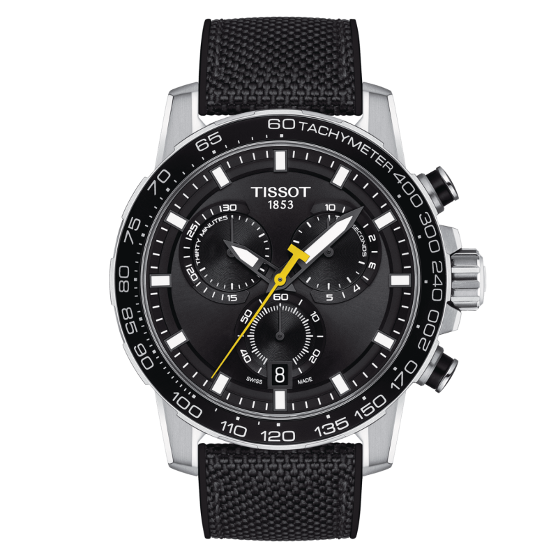 Fedezze fel a Tissot Supersport Chronograph férfi karórát, fekete számlappal és sportos textil szíjjal.